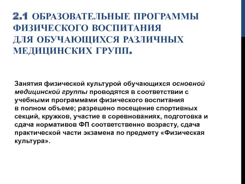 Слайд 252.1 ОБРАЗОВАТЕЛЬНЫЕ ПРОГРАММЫ ФИЗИЧЕСКОГО ВОСПИТАНИЯ ДЛЯ ОБУЧАЮЩИХСЯ РАЗЛИЧНЫХ МЕДИЦИНСКИХ ГРУПП.