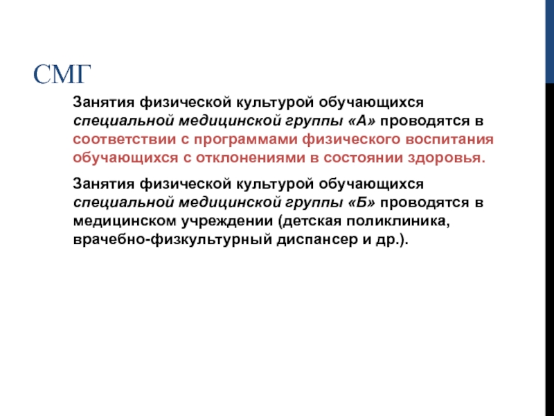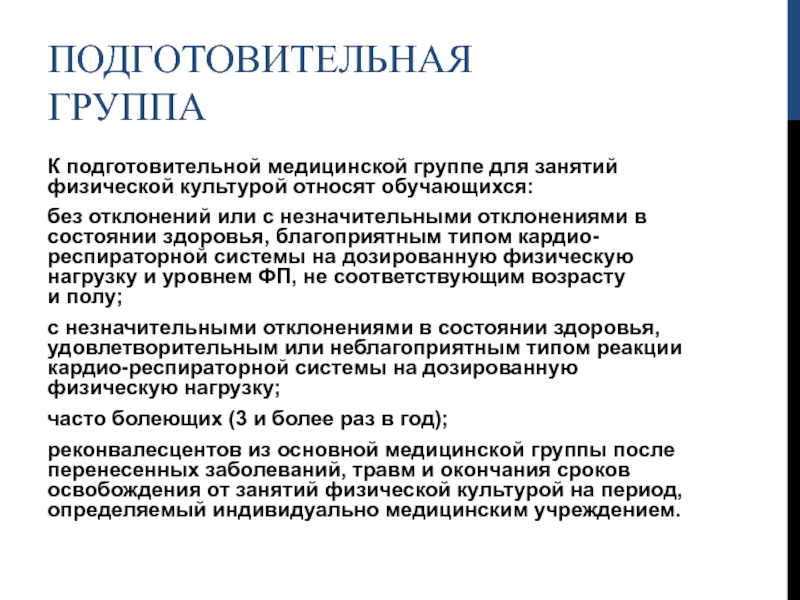 Слайд 26Занятия физической культурой обучающихся подготовительной медицинской группы проводятся в соответствии с