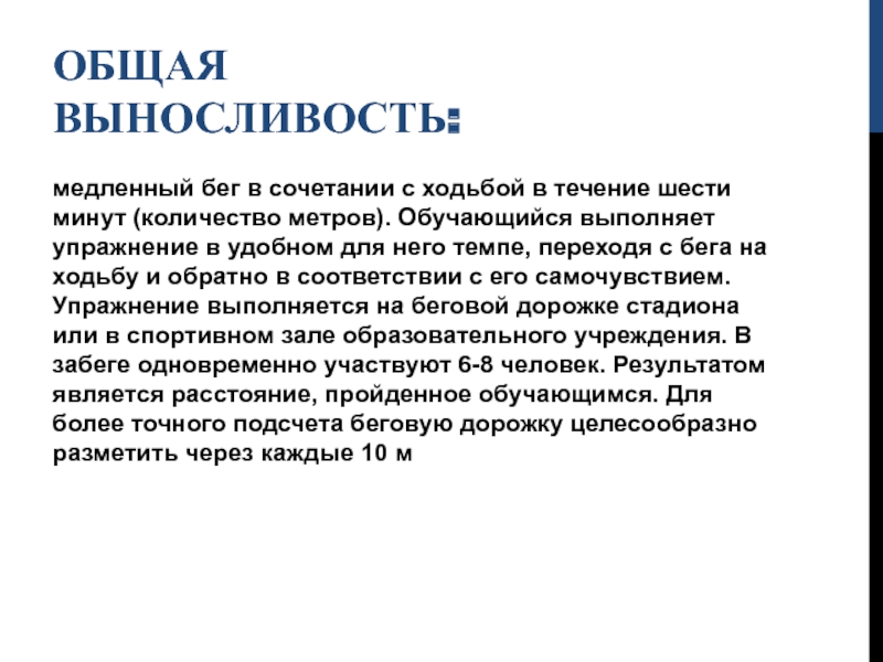 минут (количество метров). Обучающийся выполняет упражнение в удобном для него темпе, переходя с бега на ходьбу и обратно в соответствии с его самочувствием. Упражнение выполняется на беговой дорожке стадиона или в спортивном зале образовательного учреждения. В забеге одновременно участвуют 6-8 человек. Результатом является расстояние, пройденное обучающимся. Для более точного подсчета беговую дорожку целесообразно разметить через каждые 10 м
