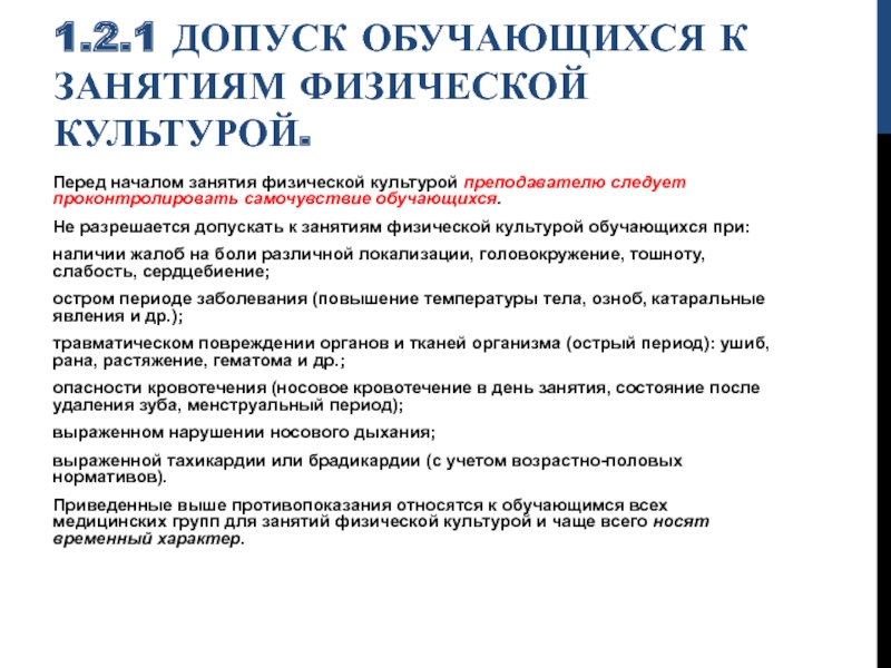 Слайд 151.2.1 ДОПУСК ОБУЧАЮЩИХСЯ К ЗАНЯТИЯМ ФИЗИЧЕСКОЙ КУЛЬТУРОЙ.