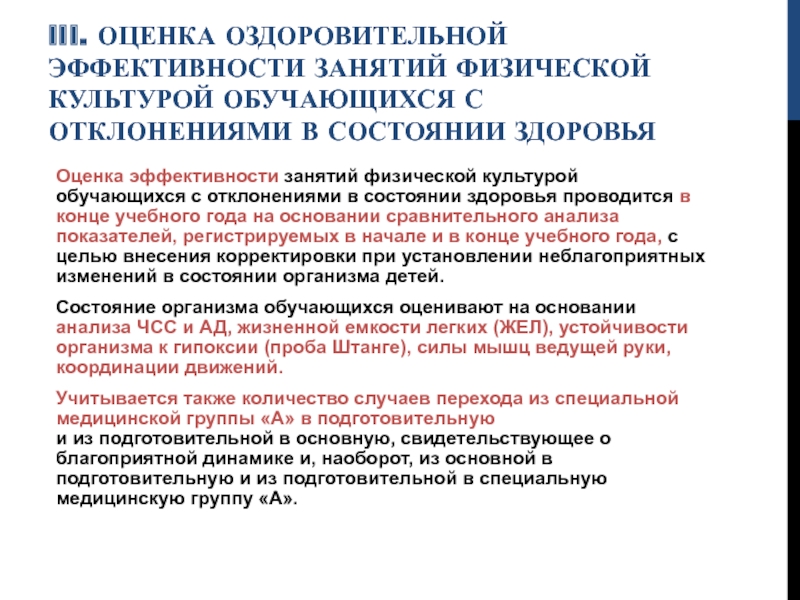 Слайд 32III. ОЦЕНКА ОЗДОРОВИТЕЛЬНОЙ ЭФФЕКТИВНОСТИ ЗАНЯТИЙ ФИЗИЧЕСКОЙ КУЛЬТУРОЙ ОБУЧАЮЩИХСЯ С ОТКЛОНЕНИЯМИ В СОСТОЯНИИ