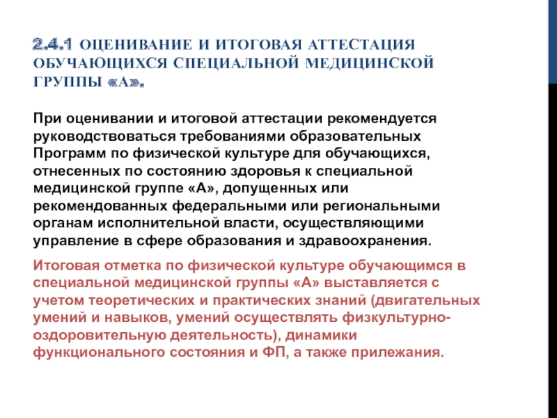 Слайд 302.4.1 ОЦЕНИВАНИЕ И ИТОГОВАЯ АТТЕСТАЦИЯ ОБУЧАЮЩИХСЯ СПЕЦИАЛЬНОЙ МЕДИЦИНСКОЙ ГРУППЫ «А».
