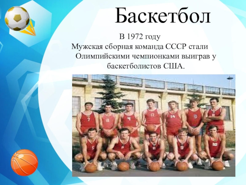 БаскетболВ 1972 году Мужская сборная команда СССР стали Олимпийскими чемпионками выиграв у баскетболистов США.