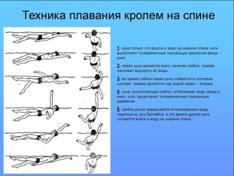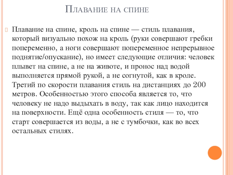 который визуально похож на кроль (руки совершают гребки попеременно, а ноги совершают попеременное непрерывное поднятие/опускание), но имеет следующие отличия: человек плывет на спине, а не на животе, и пронос над водой выполняется прямой рукой, а не согнутой, как в кроле. Третий по скорости плавания стиль на дистанциях до 200 метров. Особенностью этого способа является то, что человеку не надо выдыхать в воду, так как лицо находится на поверхности. Ещё одна особенность стиля — то, что старт совершается из воды, а не с тумбочки, как во всех остальных стилях.