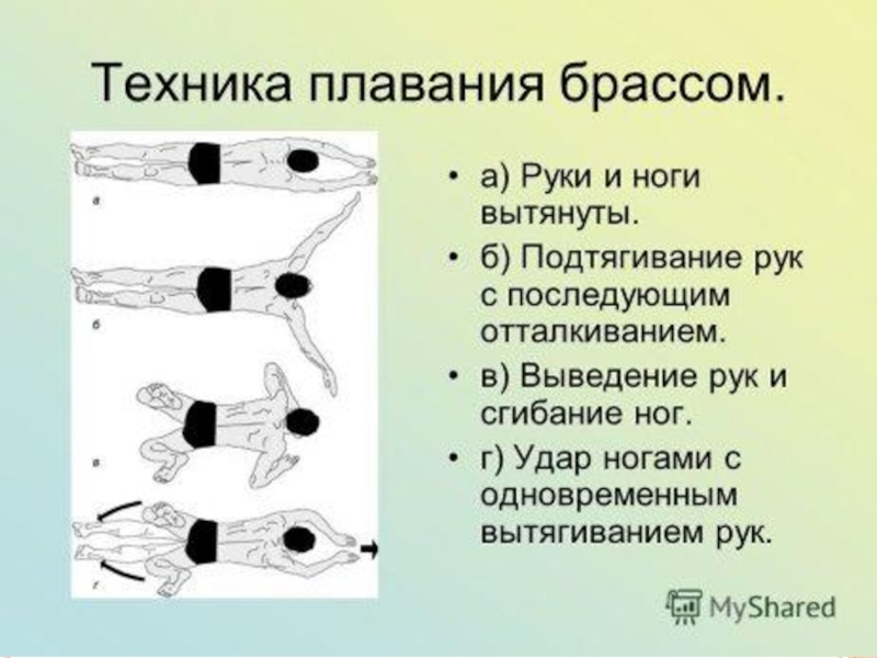 спортивного плавания на груди, при котором руки и ноги выполняют симметричные движения в плоскости, параллельной поверхности воды.