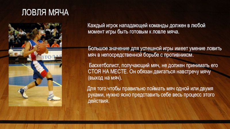 ЛОВЛЯ МЯЧА Каждый игрок нападающей команды должен в любой момент игры быть готовым к ловле мяча. Большое значение для успешной игры имеет умение ловить мяч в непосредственной борьбе с противником. Баскетболист, получающий