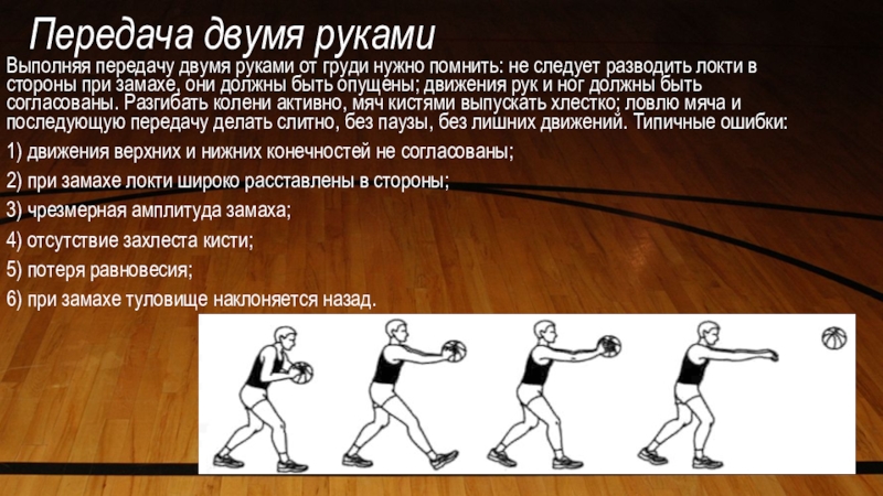 Выполняя передачу двумя руками от груди нужно помнить: не