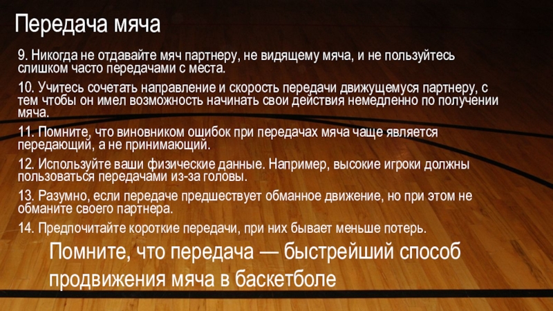 Помните, что передача — быстрейший способ продвижения мяча в баскетболе