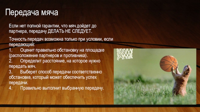 Передача мяча Если нет полной гарантии, что мяч дойдет до партнера, передачу ДЕЛАТЬ НЕ СЛЕДУЕТ.Точность передач возможна
