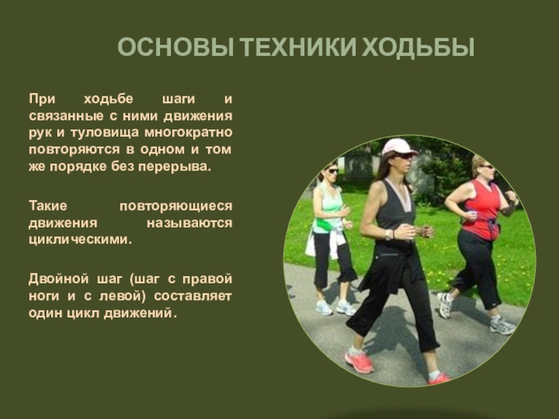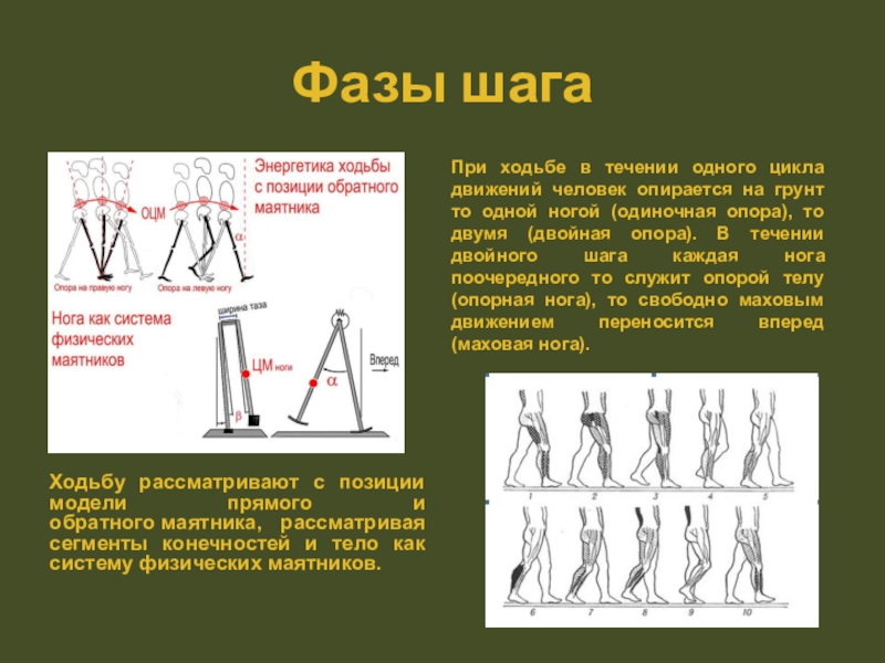 При ходьбе в течении одного цикла движений человек опирается на грунт то одной ногой (одиночная опора), то двумя (двойная опора). В течении двойного шага каждая нога поочередного то служит опорой телу (опорная нога), то свободно маховым движением переносится вперед (маховая нога).