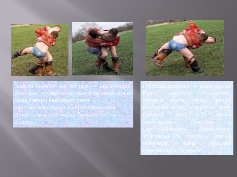 Подхват изнутри — атакующий борец маховым движением правой ноги назад вверх выбивает одну опорную ногу (левую) или обе ноги противника изнутри и скручивающим движением туловища в сторону своей опорной ноги бросает противника на землю.