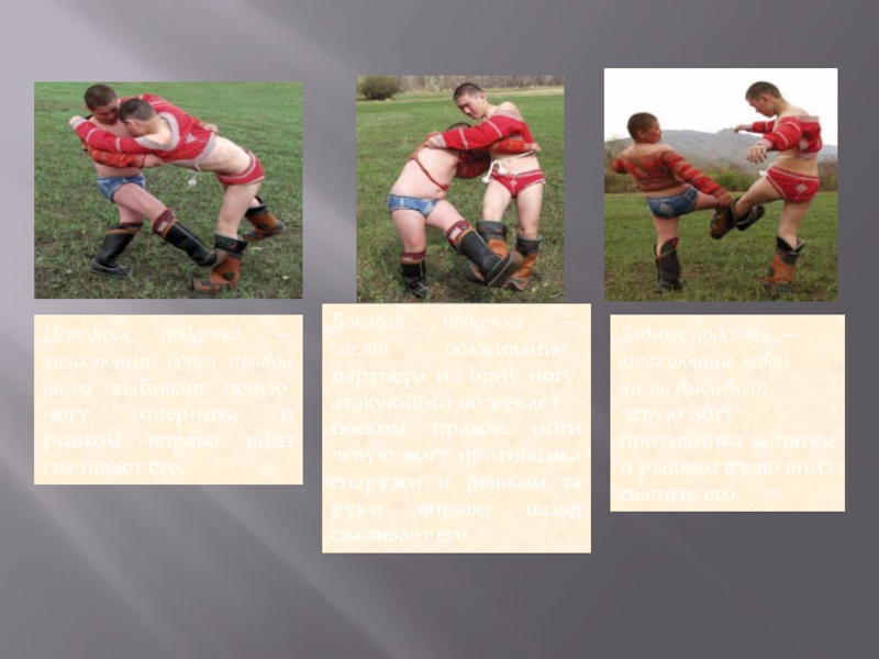 Боковая подсечка — сделав осаживание партнера на одну ногу, атакуюший подсекает