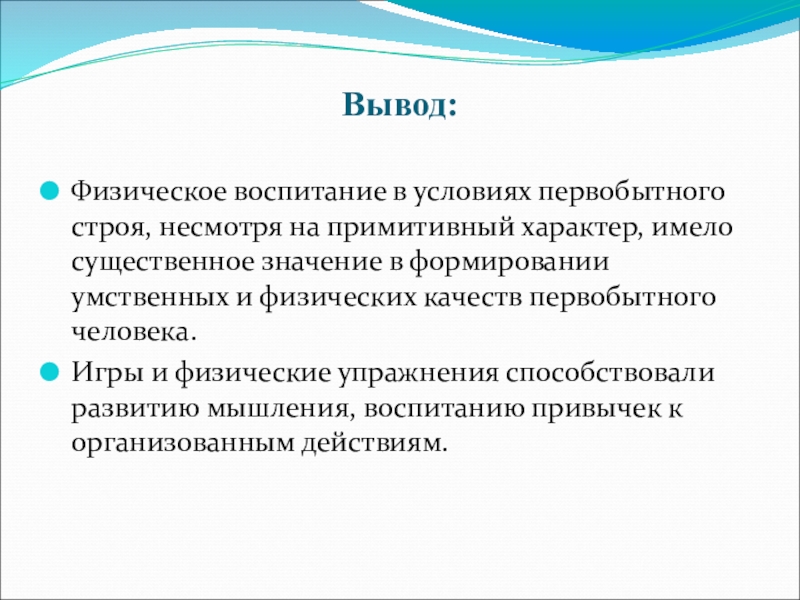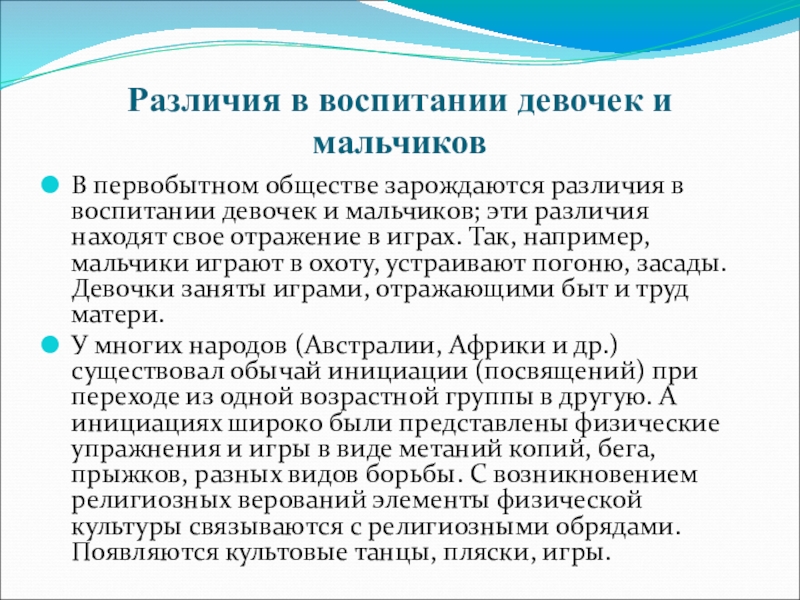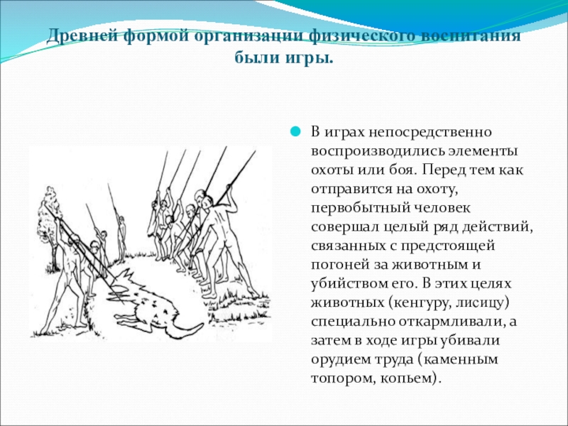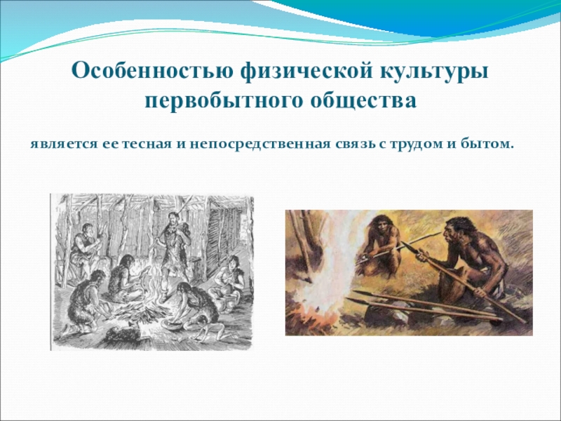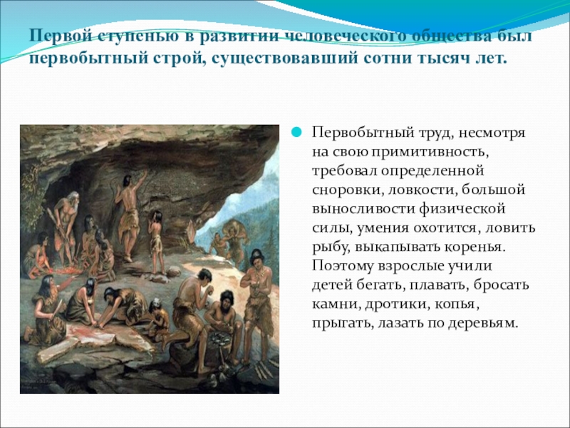 Первобытный труд, несмотря на свою примитивность, требовал определенной сноровки, ловкости, большой выносливости физической силы, умения охотится, ловить рыбу, выкапывать коренья. Поэтому взрослые учили детей бегать, плавать, бросать камни, дротики, копья, прыгать, лазать по деревьям.