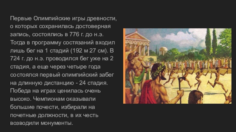 776 г. до н.э. Тогда в программу состязаний входил лишь бег на 1 стадий (192 м 27 см). В 724 г. до н.э. проводился бег уже на 2 стадия, а еще через четыре года состоялся первый олимпийский забег на длинную дистанцию - 24 стадия. Победа на играх ценилась очень высоко. Чемпионам оказывали большие почести, избирали на почетные должности, в их честь возводили монументы.