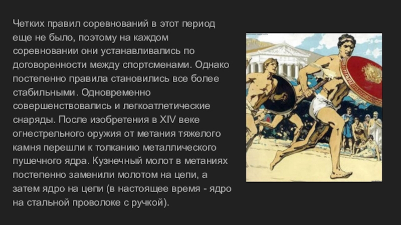 каждом соревновании они устанавливались по договоренности между спортсменами. Однако постепенно правила становились все более стабильными. Одновременно совершенствовались и легкоатлетические снаряды. После изобретения в XIV веке огнестрельного оружия от метания тяжелого камня перешли к толканию металлического пушечного ядра. Кузнечный молот в метаниях постепенно заменили молотом на цепи, а затем ядро на цепи (в настоящее время - ядро на стальной проволоке с ручкой).