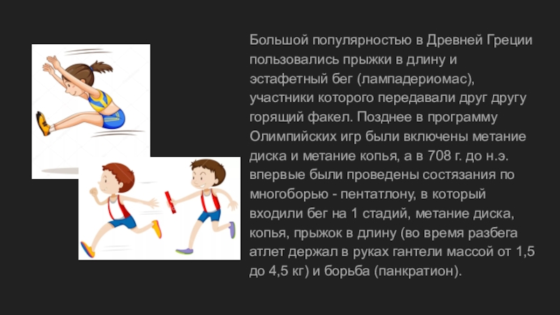 Слайд 4Большой популярностью в Древней Греции пользовались прыжки в длину и эстафетный