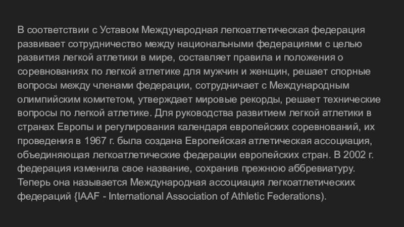 федерациями с целью развития легкой атлетики в мире, составляет правила и положения о соревнованиях по легкой атлетике для мужчин и женщин, решает спорные вопросы между членами федерации, сотрудничает с Международным олимпийским комитетом, утверждает мировые рекорды, решает технические вопросы по легкой атлетике. Для руководства развитием легкой атлетики в странах Европы и регулирования календаря европейских соревнований, их проведения в 1967 г. была создана Европейская атлетическая ассоциация, объединяющая легкоатлетические федерации европейских стран. В 2002 г. федерация изменила свое название, сохранив прежнюю аббревиатуру. Теперь она называется Международная ассоциация легкоатлетических федераций {IAAF - International Association of Athletic Federations).