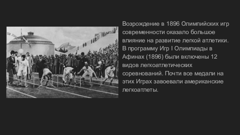 Слайд 10Возрождение в 1896 Олимпийских игр современности оказало большое влияние на развитие