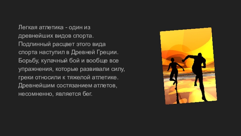 вида спорта наступил в Древней Греции. Борьбу, кулачный бой и вообще все упражнения, которые развивали силу, греки относили к тяжелой атлетике. Древнейшим состязанием атлетов, несомненно, является бег.