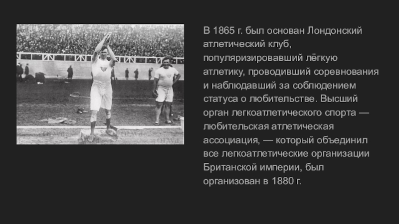 Слайд 8В 1865 г. был основан Лондонский атлетический клуб, популяризировавший лёгкую атлетику,