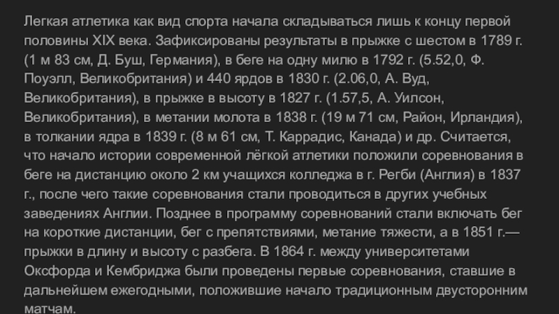 половины XIX века. Зафиксированы результаты в прыжке с шестом в 1789 г. (1 м 83 см, Д. Буш, Германия), в беге на одну милю в 1792 г. (5.52,0, Ф. Поуэлл, Великобритания) и 440 ярдов в 1830 г. (2.06,0, А. Вуд, Великобритания), в прыжке в высоту в 1827 г. (1.57,5, А. Уилсон, Великобритания), в метании молота в 1838 г. (19 м 71 см, Район, Ирландия), в толкании ядра в 1839 г. (8 м 61 см, Т. Каррадис, Канада) и др. Считается, что начало истории современной лёгкой атлетики положили соревнования в беге на дистанцию около 2 км учащихся колледжа в г. Регби (Англия) в 1837 г., после чего такие соревнования стали проводиться в других учебных заведениях Англии. Позднее в программу соревнований стали включать бег на короткие дистанции, бег с препятствиями, метание тяжести, а в 1851 г.— прыжки в длину и высоту с разбега. В 1864 г. между университетами Оксфорда и Кембриджа были проведены первые соревнования, ставшие в дальнейшем ежегодными, положившие начало традиционным двусторонним матчам.