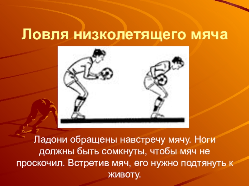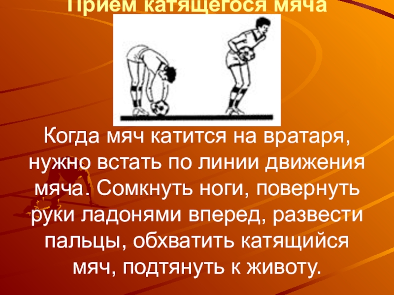движения мяча. Сомкнуть ноги, повернуть руки ладонями вперед, развести пальцы, обхватить катящийся мяч, подтянуть к животу.