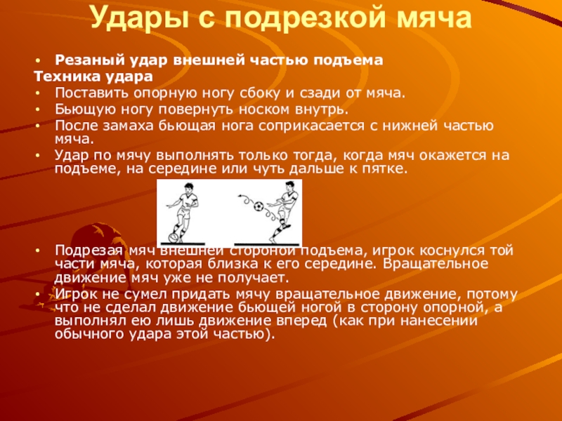 Подрезая мяч внешней стороной подъема, игрок коснулся той части мяча, которая близка к его середине. Вращательное движение мяч уже не получает.