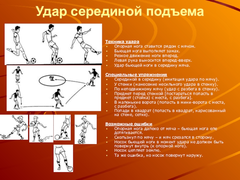 Удар по мячу выполнять только тогда, когда мяч окажется на подъеме, на середине или чуть дальше к пятке.