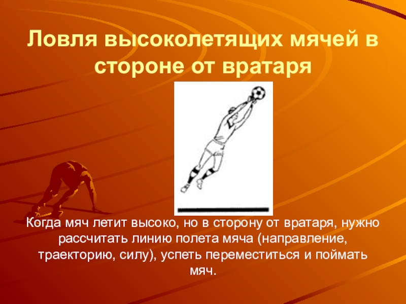 Слайд 15Ловля высоколетящих мячей в стороне от вратаря