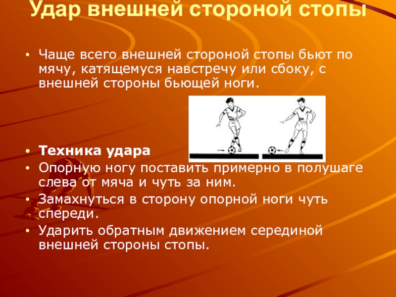 Опорную ногу поставить примерно в полушаге слева от мяча и чуть за ним.