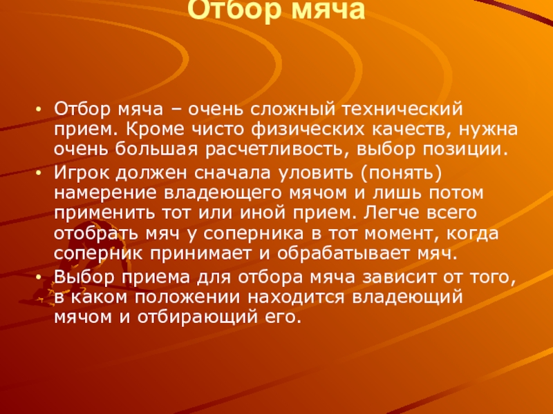Отбор мяча – очень сложный технический прием. Кроме чисто физических