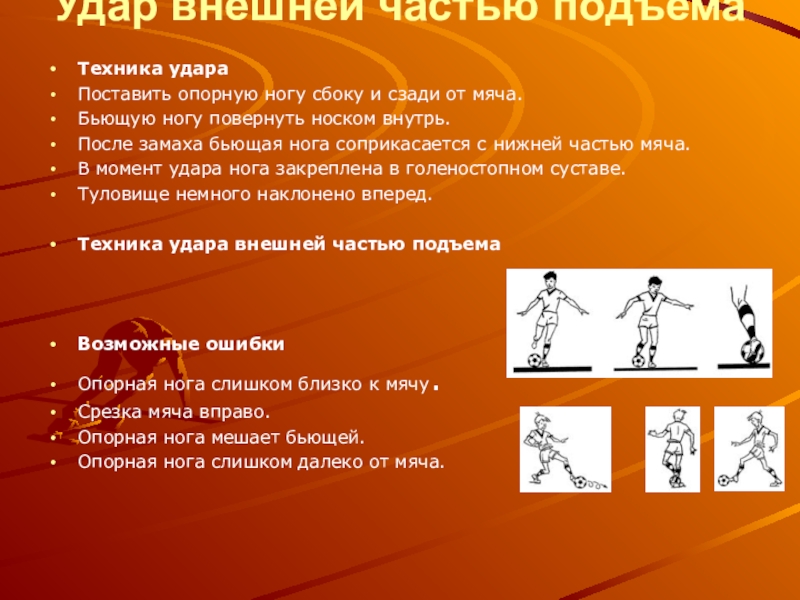 Носок опорной ноги развернут наружу или внутрь. Носок бьющей ноги не попал в середину мяча.