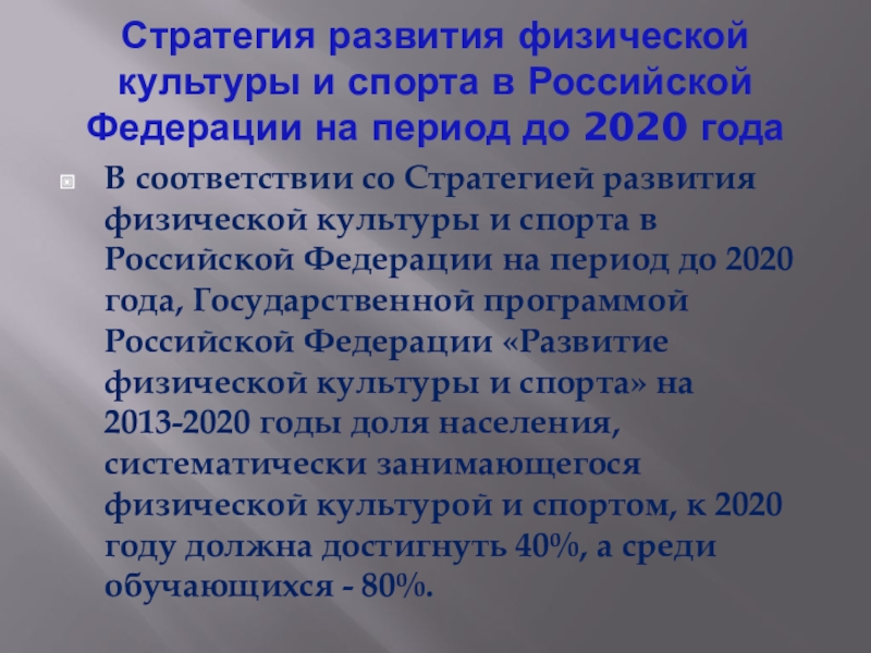 В соответствии со Стратегией развития физической культуры и спорта в Российской Федерации на период до 2020 года, Государственной программой Российской Федерации «Развитие физической культуры и спорта» на 2013-2020 годы доля населения, систематически занимающегося физической культурой и спортом, к 2020 году должна достигнуть 40%, а среди обучающихся - 80%.