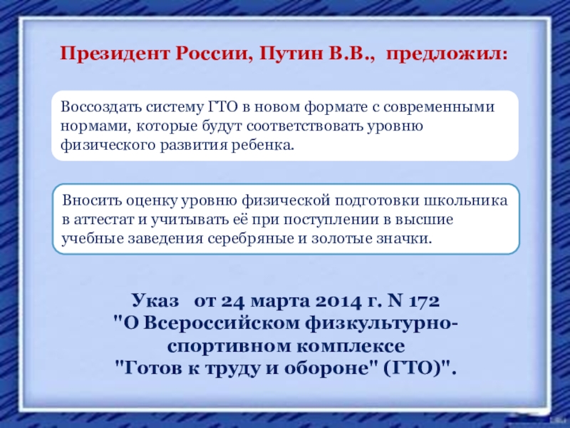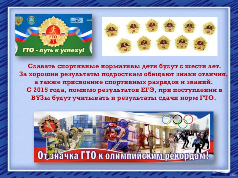 Вносить оценку уровню физической подготовки школьника в аттестат и учитывать её при поступлении в высшие учебные заведения серебряные и золотые значки.