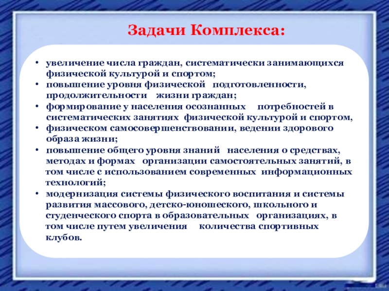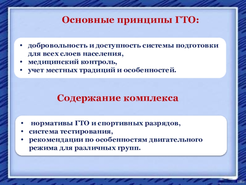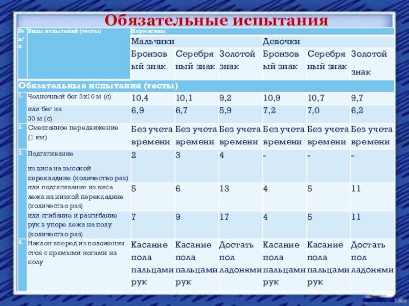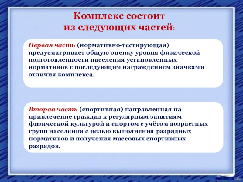 Первая часть (нормативно-тестирующая) предусматривает общую оценку уровня физической подготовленности населения установленных нормативов с последующим награждением значками отличия комплекса.