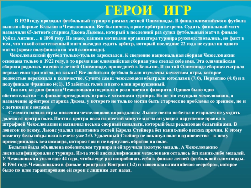 Олимпиады. В финал олимпийского футбола вышли сборные Бельгии и Чехословакии. Все бы ничего, кроме арбитра встречи. Судить финальный матч назначили 65-летнего старика Джона Льюиса, который в последний раз судил футбольный матч в финале Кубка Англии… в 1898 году. Не знаю, какими мотивами организатора турнира руководствовались, но факт в том, что такой ответственный матч выходил судить арбитр, который последние 22 года не судил ни одного матча (кроме полуфинала на этой олимпиаде).