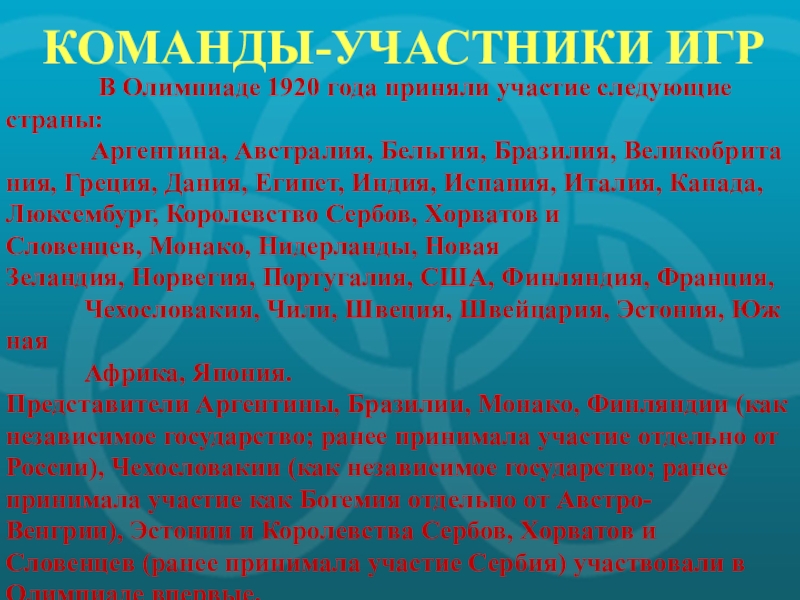 В Олимпиаде 1920 года приняли участие следующие страны: