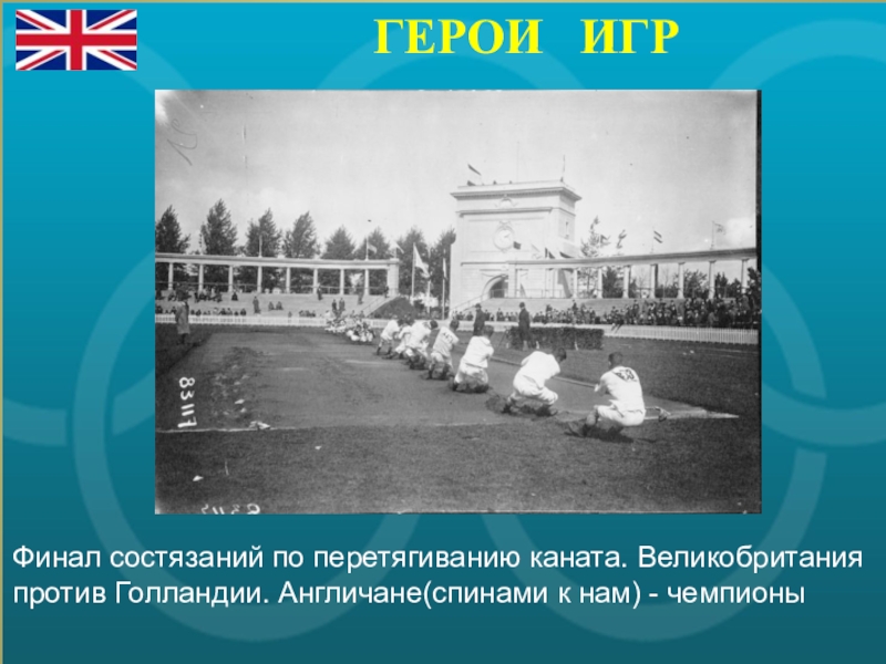 Финал состязаний по перетягиванию каната. Великобритания против Голландии. Англичане(спинами