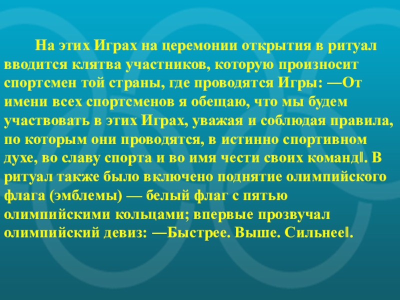 которую произносит спортсмен той страны, где проводятся Игры: ―От имени всех спортсменов я обещаю, что мы будем участвовать в этих Играх, уважая и соблюдая правила, по которым они проводятся, в истинно спортивном духе, во славу спорта и во имя чести своих команд‖. В ритуал также было включено поднятие олимпийского флага (эмблемы) — белый флаг с пятью олимпийскими кольцами; впервые прозвучал олимпийский девиз: ―Быстрее. Выше. Сильнее‖.