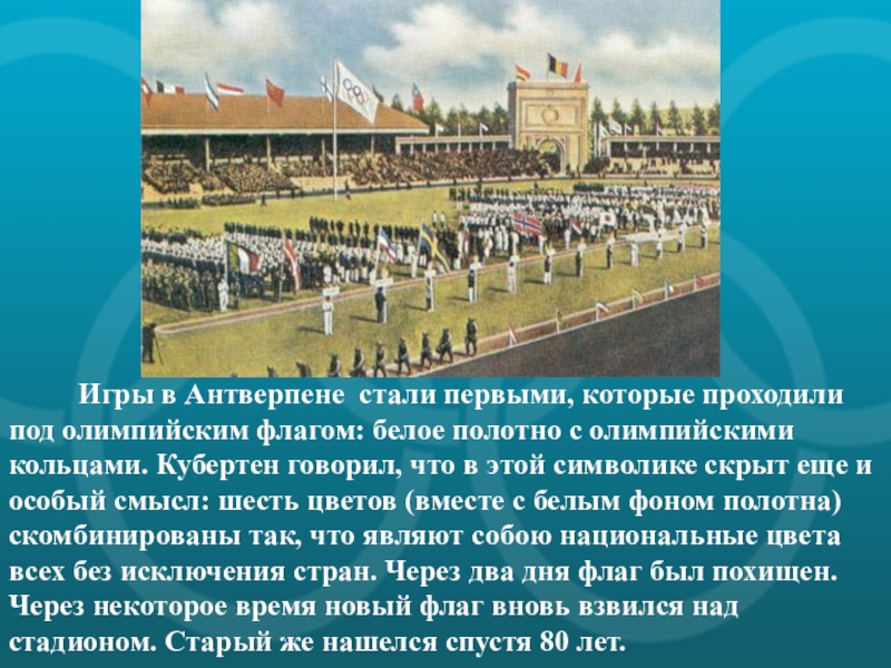 полотно с олимпийскими кольцами. Кубертен говорил, что в этой символике скрыт еще и особый смысл: шесть цветов (вместе с белым фоном полотна) скомбинированы так, что являют собою национальные цвета всех без исключения стран. Через два дня флаг был похищен. Через некоторое время новый флаг вновь взвился над стадионом. Старый же нашелся спустя 80 лет.