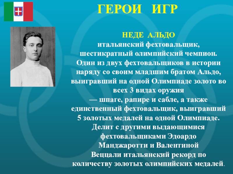 НЕДЕ АЛЬДО итальянский фехтовальщик, шестикратный олимпийский чемпион. Один из двух