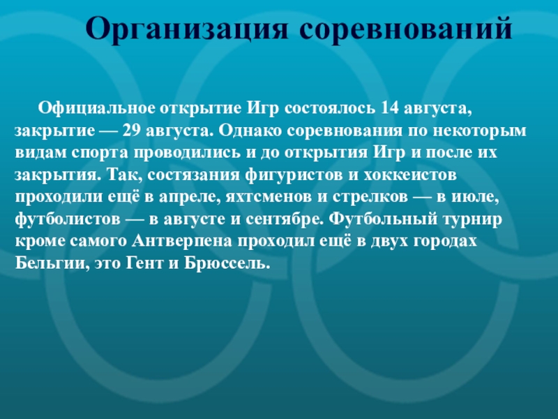 Однако соревнования по некоторым видам спорта проводились и до открытия Игр и после их закрытия. Так, состязания фигуристов и хоккеистов проходили ещё в апреле, яхтсменов и стрелков — в июле, футболистов — в августе и сентябре. Футбольный турнир кроме самого Антверпена проходил ещё в двух городах Бельгии, это Гент и Брюссель.