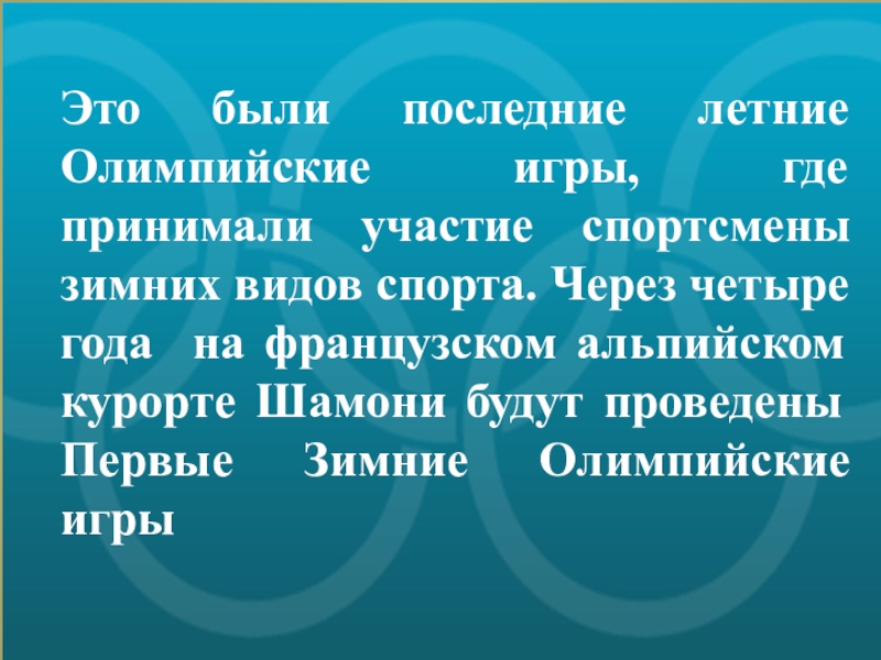 видов спорта. Через четыре года на французском альпийском курорте Шамони будут проведены Первые Зимние Олимпийские игры
