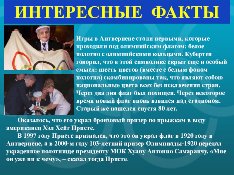 В 1997 году Присте признался, что это он украл флаг в 1920 году в Антверпене, а в 2000-м году 103-летний призер Олимпиады-1920 передал украденное полотнище президенту МОК Хуану Антонио Самаранчу. «Мне он уже ни к чему», – сказал тогда Присте.