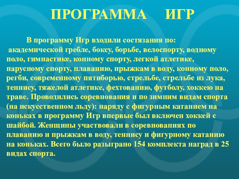 академической гребле, боксу, борьбе, велоспорту, водному поло, гимнастике, конному спорту, легкой атлетике, парусному спорту, плаванию, прыжкам в воду, конному поло, регби, современному пятиборью, стрельбе, стрельбе из лука, теннису, тяжелой атлетике, фехтованию, футболу, хоккею на траве. Проводились соревнования и по зимним видам спорта (на искусственном льду): наряду с фигурным катанием на коньках в программу Игр впервые был включен хоккей с шайбой. Женщины участвовали в соревнованиях по плаванию и прыжкам в воду, теннису и фигурному катанию на коньках. Всего было разыграно 154 комплекта наград в 25 видах спорта.