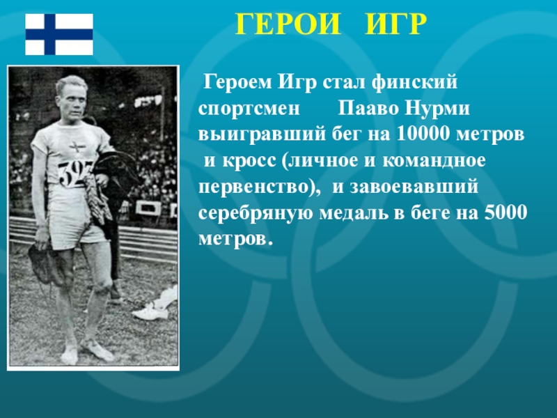 Одним из героев Игр стал финский спортсмен Пааво Нурми(2), выигравший бег на 10000 метров и кросс (личное и командное первенство) и завоевавший серебряную медаль в беге на 5000 метров.