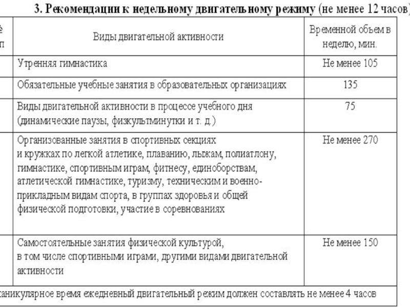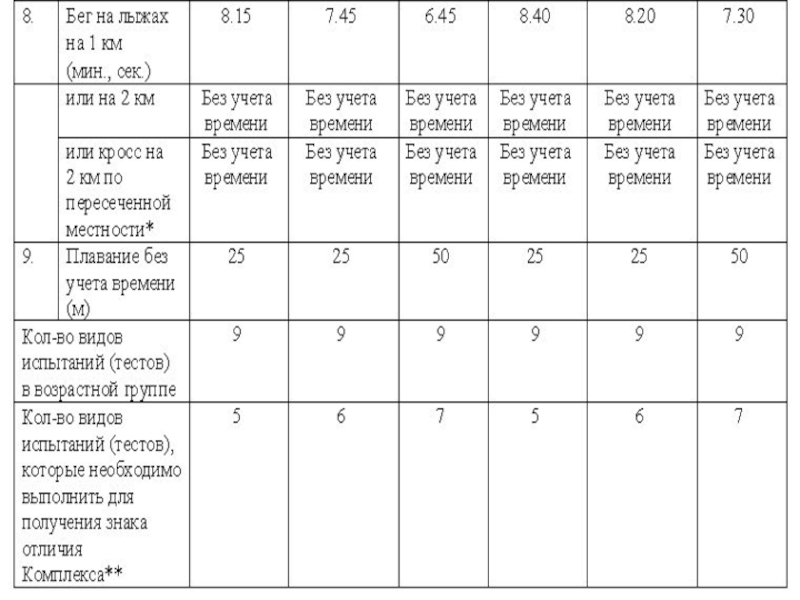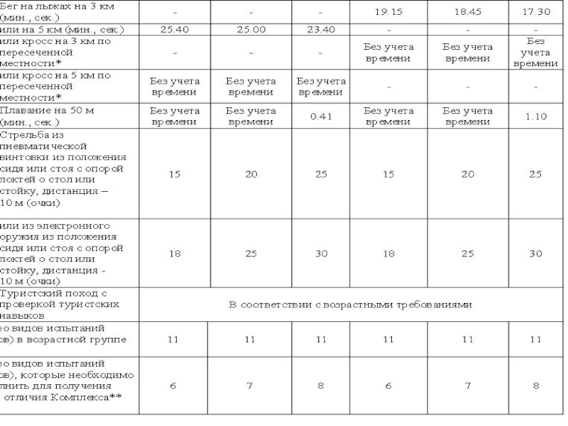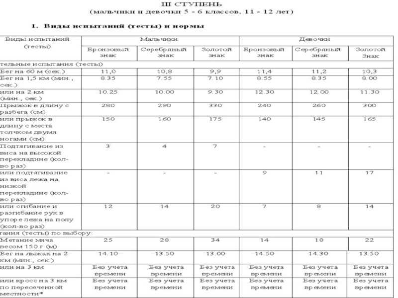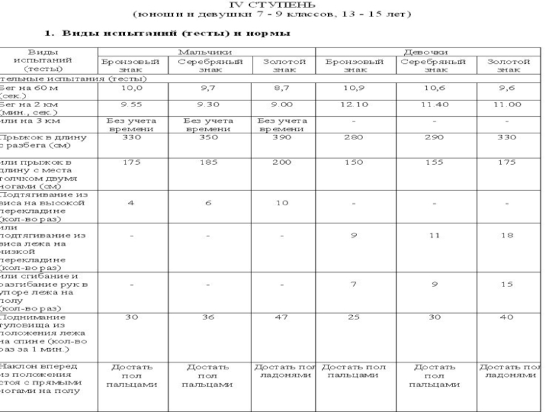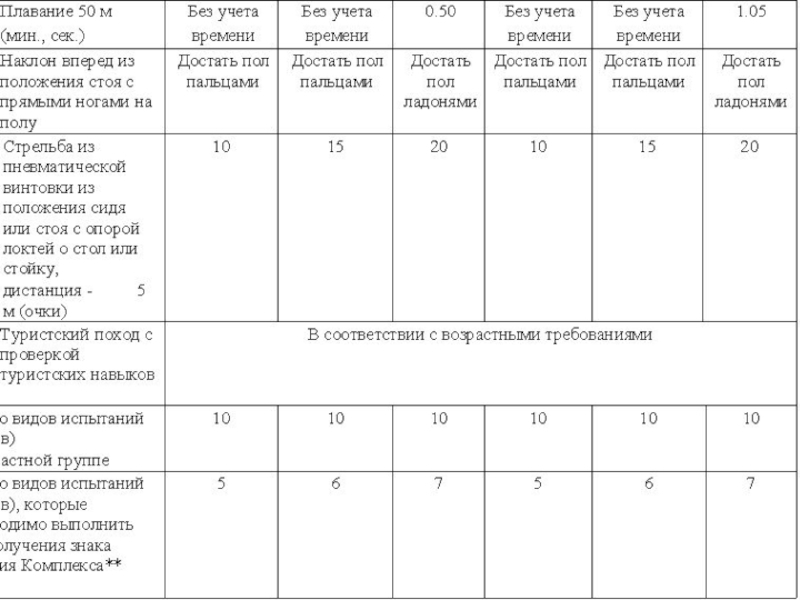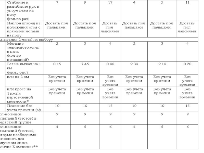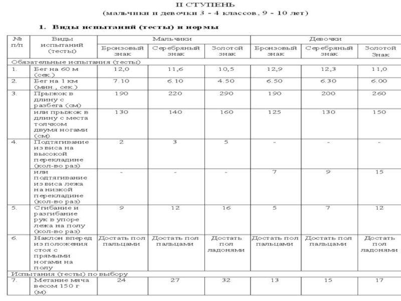 3.Перечень видов испытаний Комплекса ГТО, требования к условиям его сдачи приведены в таблицах (их разработка выполнена тщательно и детально , Правительством РФ 2014г. в соответствии с медицинскими нормами двигательного режима для каждого возраста.