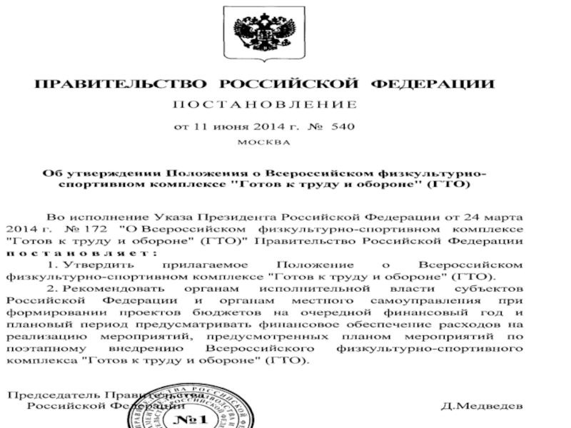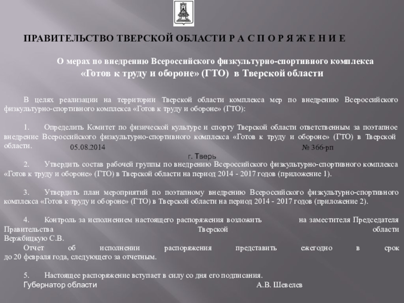 1. Определить Комитет по физической культуре и спорту Тверской области ответственным за поэтапное внедрение Всероссийского физкультурно-спортивного комплекса «Готов к труду и обороне» (ГТО) в Тверской области.