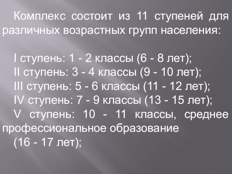 Слайд 18Комплекс состоит из 11 ступеней для различных возрастных групп населения: