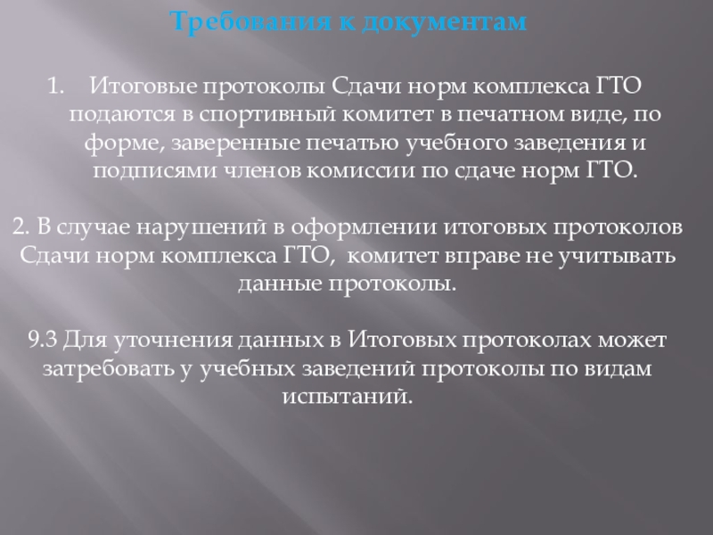 2. В случае нарушений в оформлении итоговых протоколов Сдачи норм комплекса ГТО, комитет вправе не учитывать данные протоколы.
